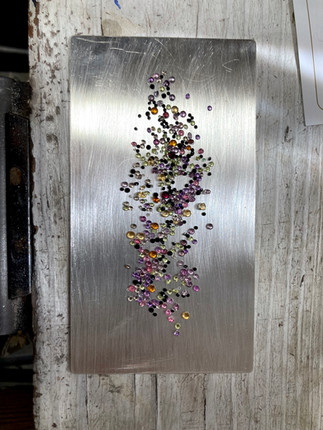 They ended up sitting on my shelf for some years, until I came up with the idea to use all of them for one piece. Instead of sitting down to do an otherwise very technical project of setting a million little gems, I decided to write an intention for every gemstone I set into a sterling silver cuff.